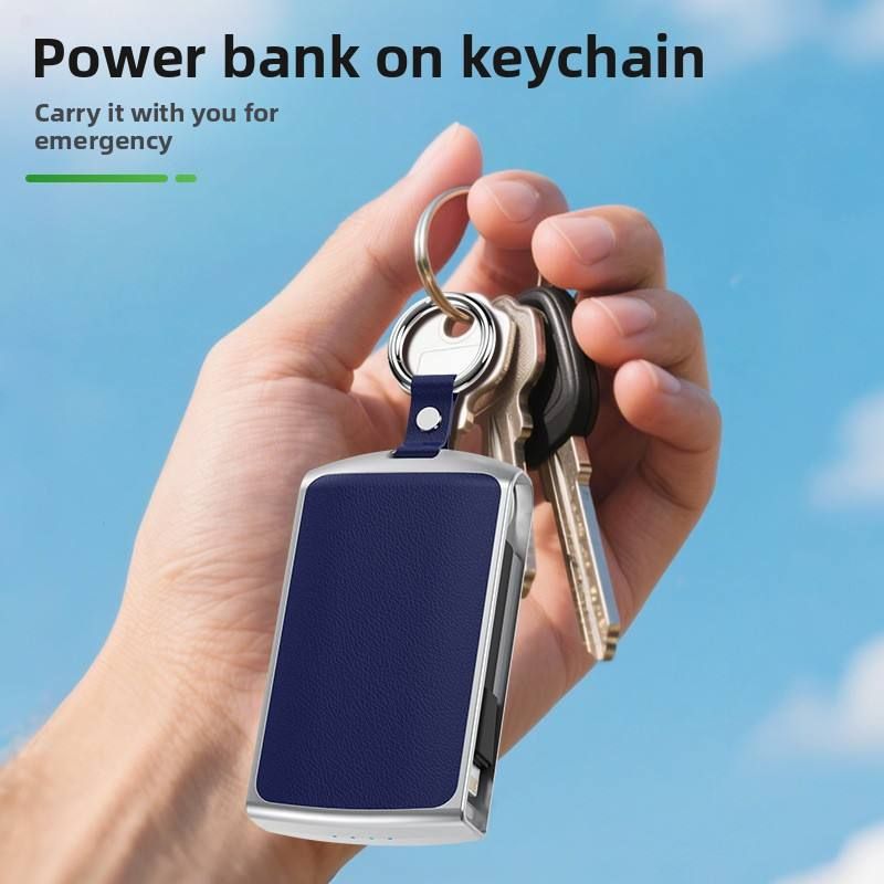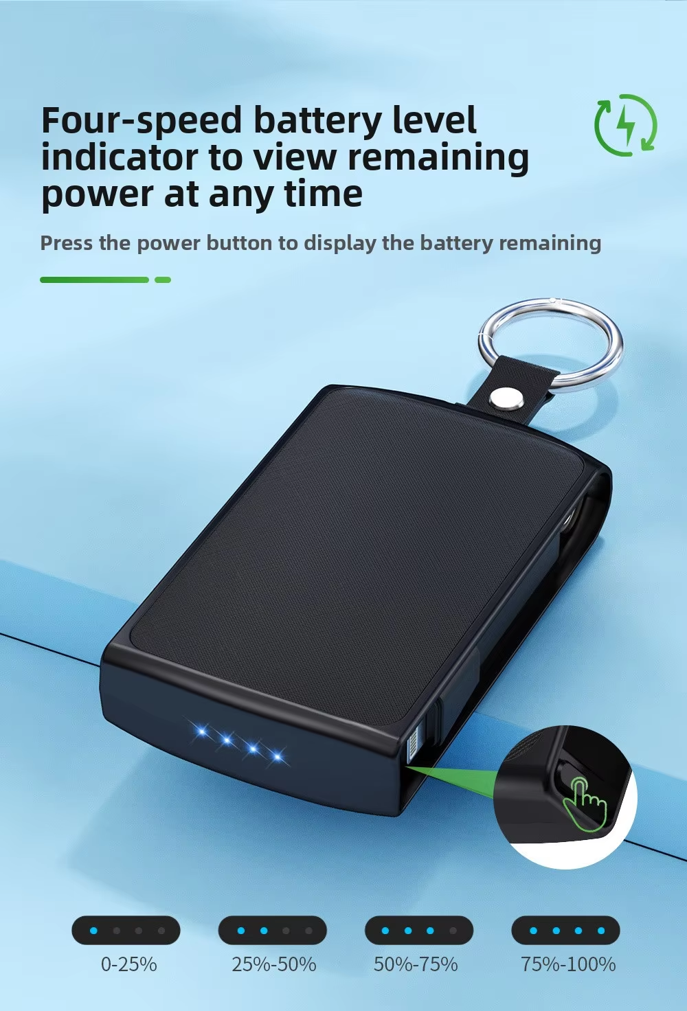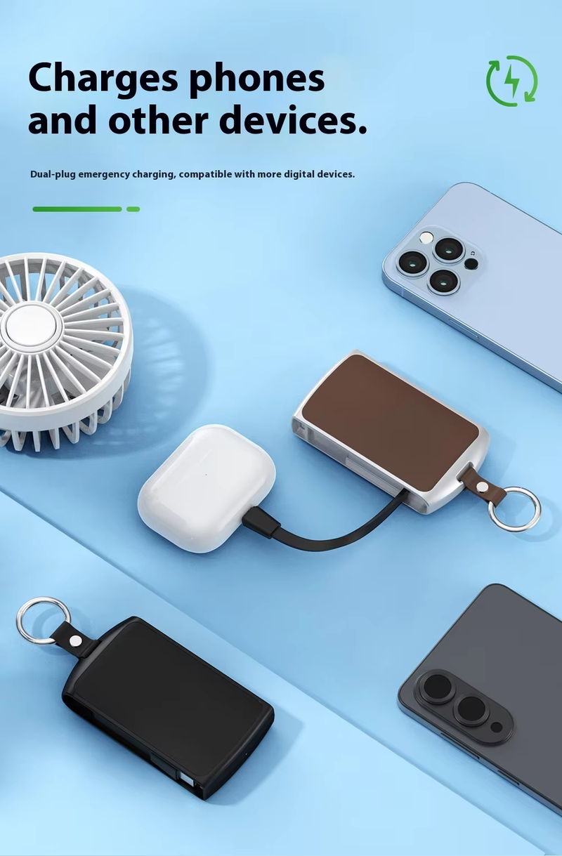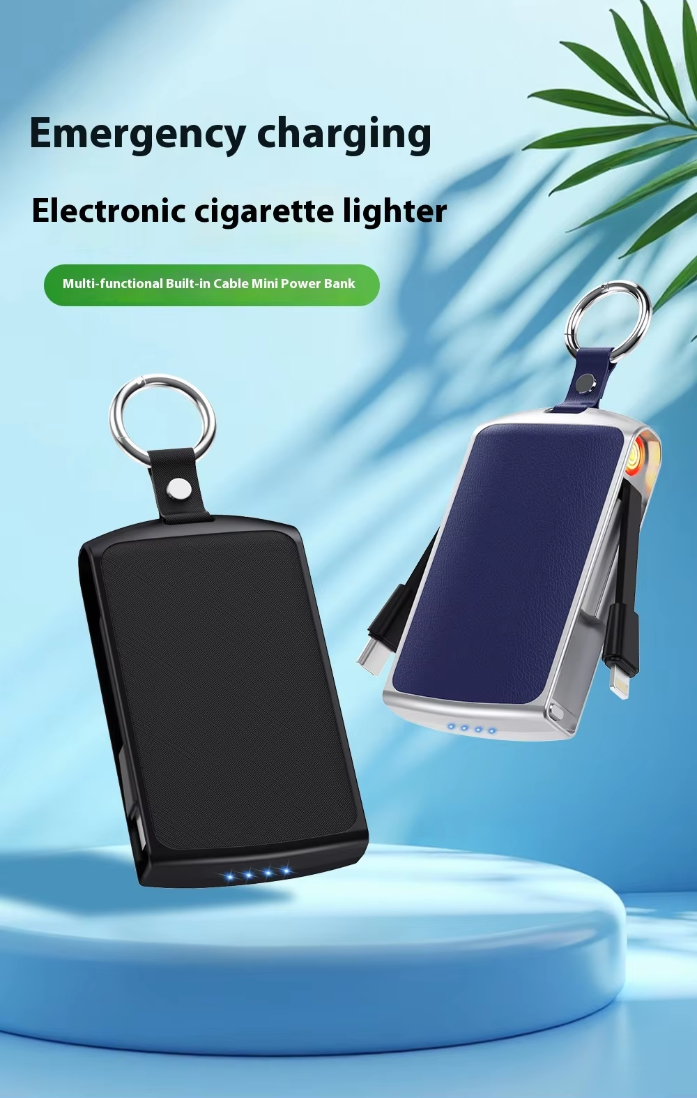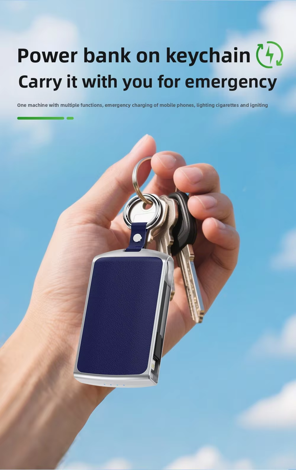 Portable mini emergency power bank keyring charger with cigarette lighter, built-in dual cables, emergency power bank.