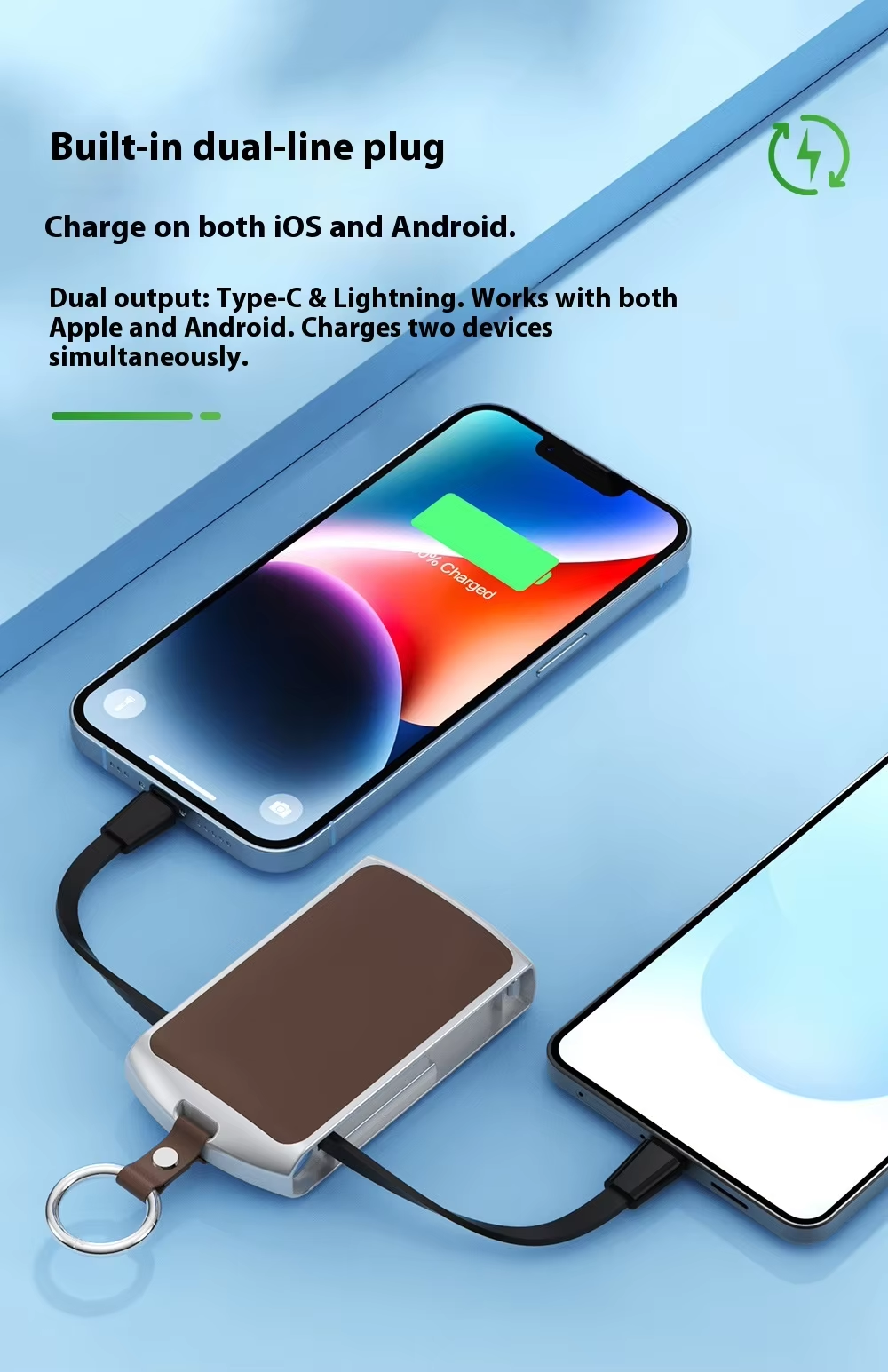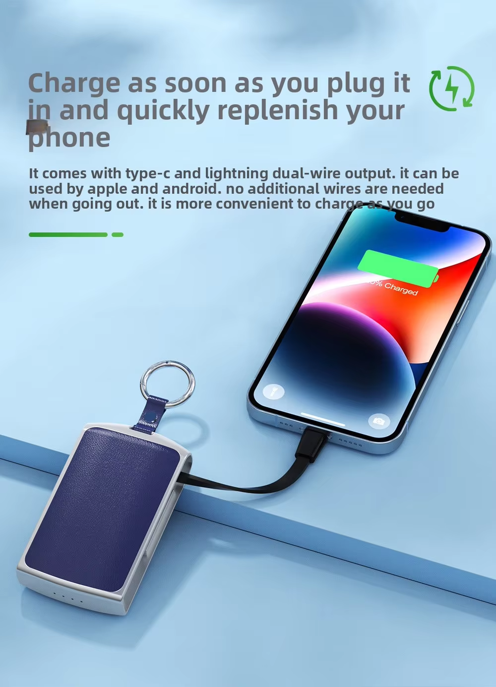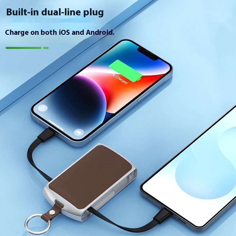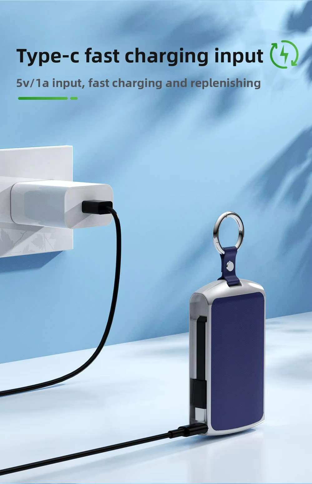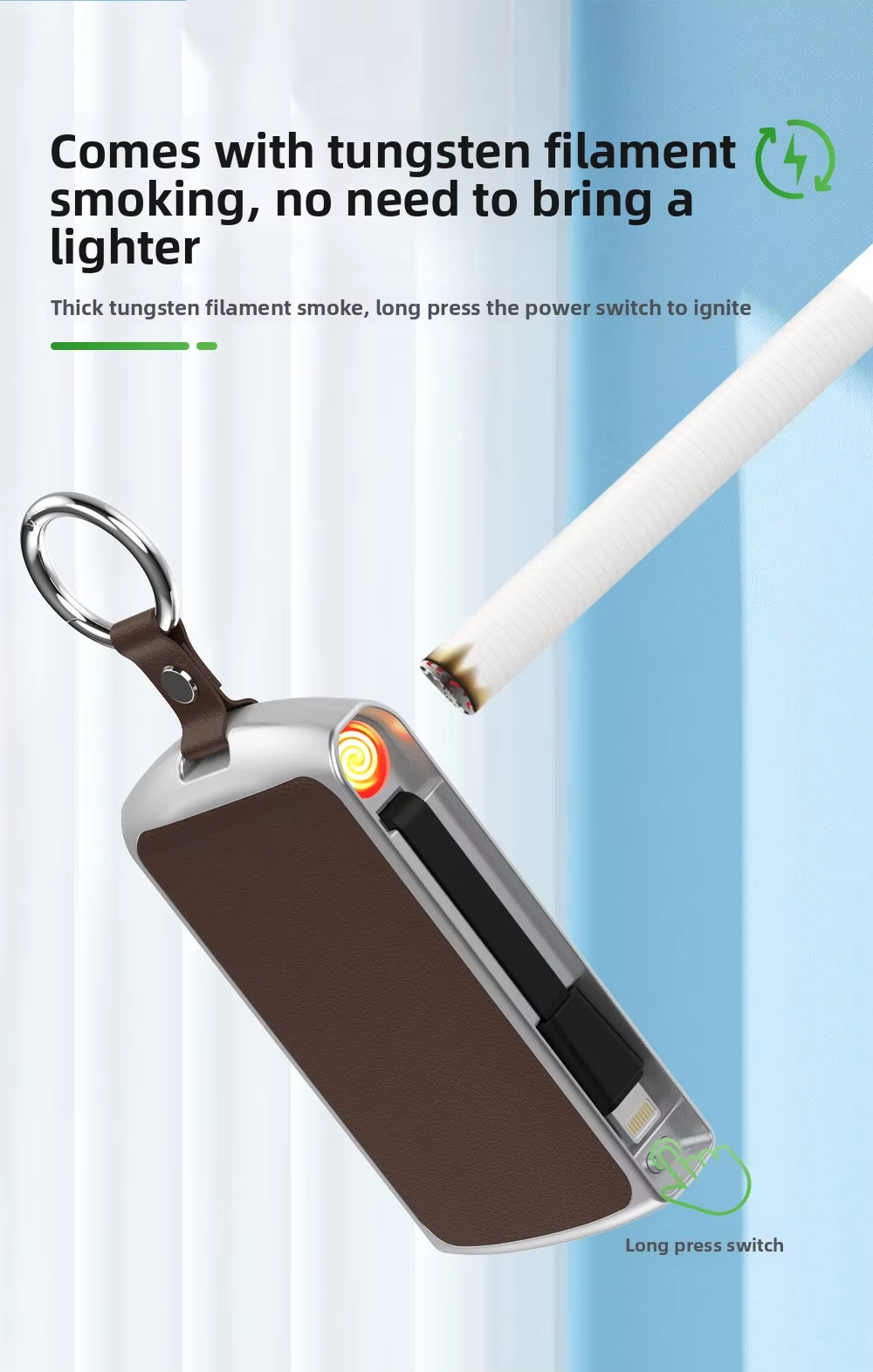 Portable mini emergency power bank keyring charger with cigarette lighter, built-in dual cables, emergency power bank.